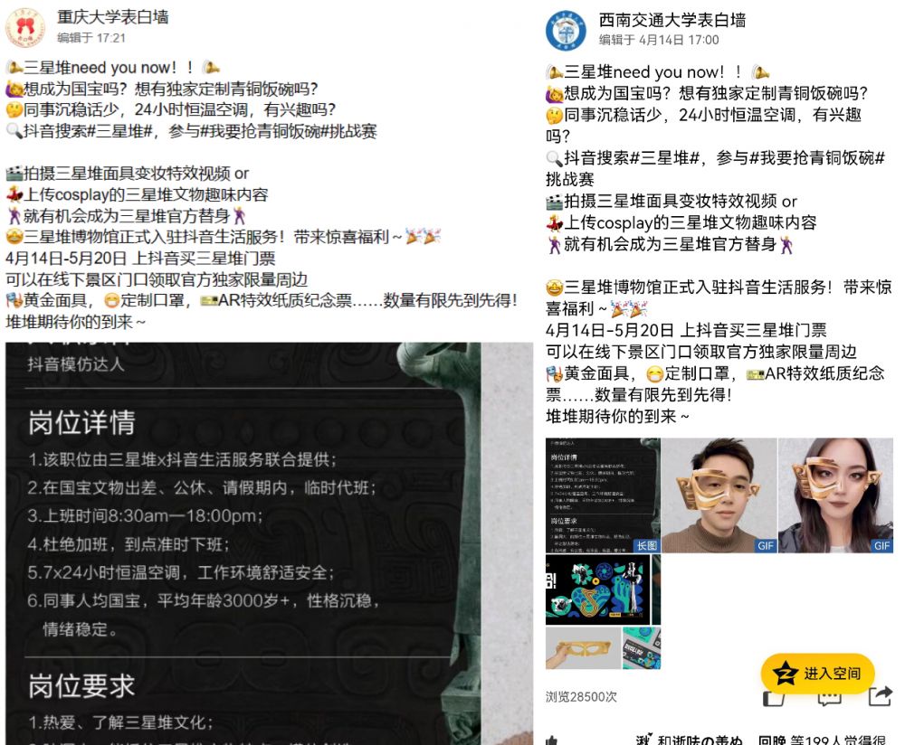 抖音在本次活动中顺势玩起了应聘梗,即让三星堆博物馆开放招聘岗位,发起全网招聘“文物替身”,水到渠成地推出cosplay挑战赛。以大学生非常熟悉的“应聘”为话题切口,自然拉近了三星堆文物与年轻一代之间的距离,可谓是“四两拨千斤”。
